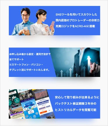 ACRO-AIとは「国内屈指のプロトレーダーの頭脳をたった”1つ”のシステムに集約」を掲げた投資システムで、「平均月利27%達成」「平均収益50万円達成」といった実績があるとのこと。